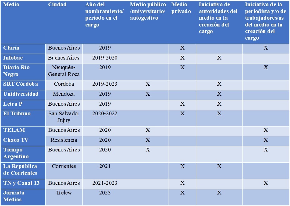 From a qualitative approach, the research inquires about the factors that converged in the creation of the new role in Argentinian media, regarding three dimensions of analysis: macrostructural, organizational and deontological.