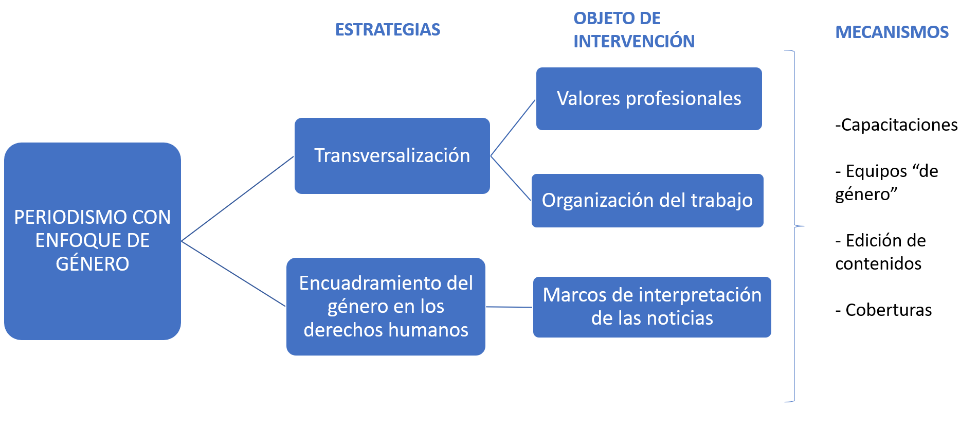 Hemos caracterizado la transversalización de la perspectiva de género y su encuadre en el enfoque de derechos humanos como estrategias desde las cuales se desarrolló el trabajo de las editoras en los medios y se buscó legitimar su rol. Asimismo, podemos avanzar y relacionar la transversalización a la reformulación de los valores profesionales y la reorganización del trabajo en los medios, y al encuadramiento con las modificaciones de los marcos de interpretación de los acontecimientos noticiables, si bien, en los hechos, no siempre es posible trazar divisiones claras entre las operaciones que involucran ambos procesos (véase gráfico1).