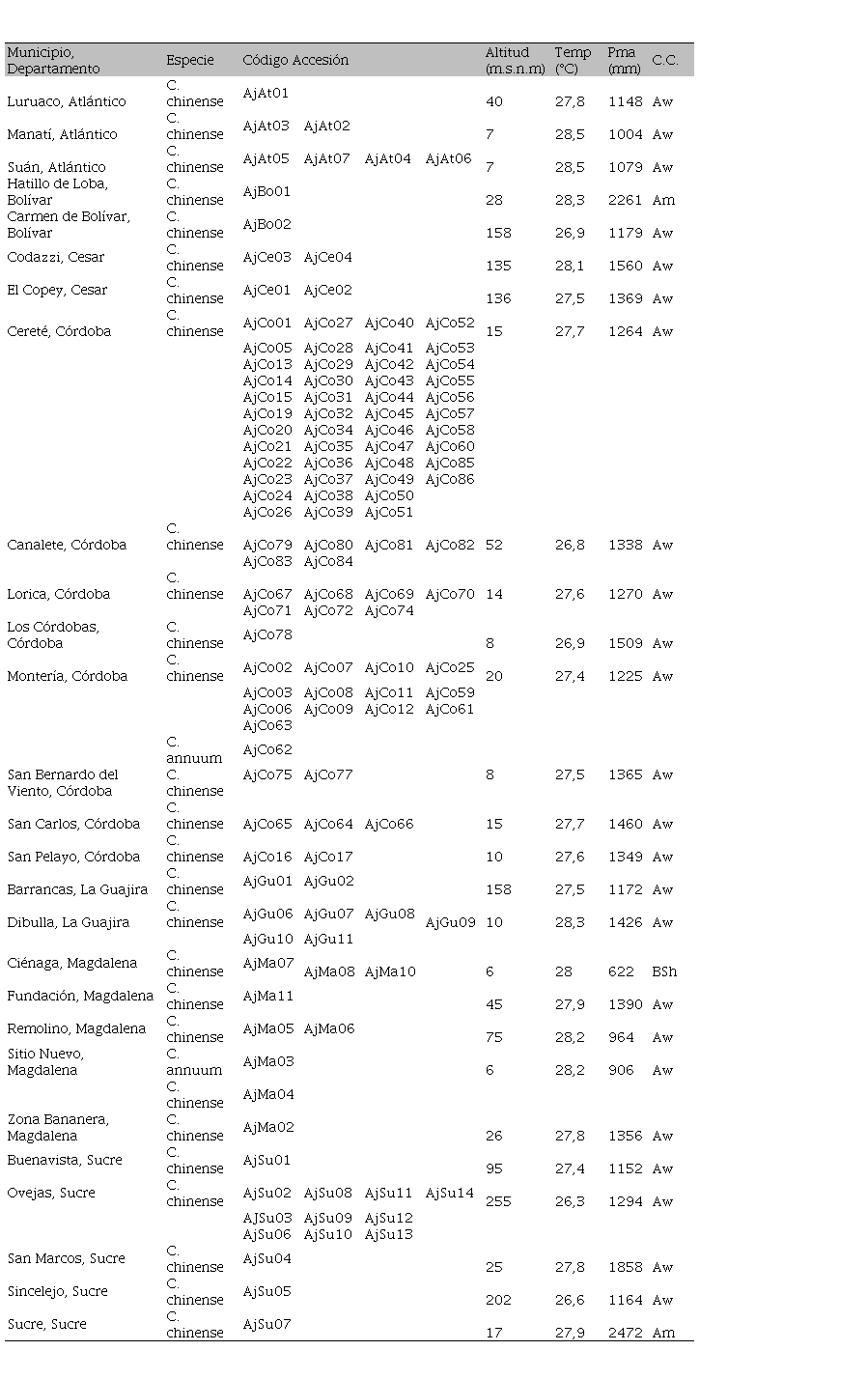 La investigación se desarrolló en Agrosavia CI. Caribia, ubicado en Zona Bananera (Magdalena), con coordenadas 10° 47' N y 74° 10' W, altitud de 18 m.s.n.m., temperatura media de 28°C, humedad relativa del 82%, precipitación media anual de 1280 mm y zona de vida de bosque seco tropical. El recurso genético correspondió a 125 accesiones de ají dulce que conforman la colección de germoplasma de Corpoica CI. Caribia colectada en 2013 en siete departamentos de la región Caribe colombiana (Tabla 1).