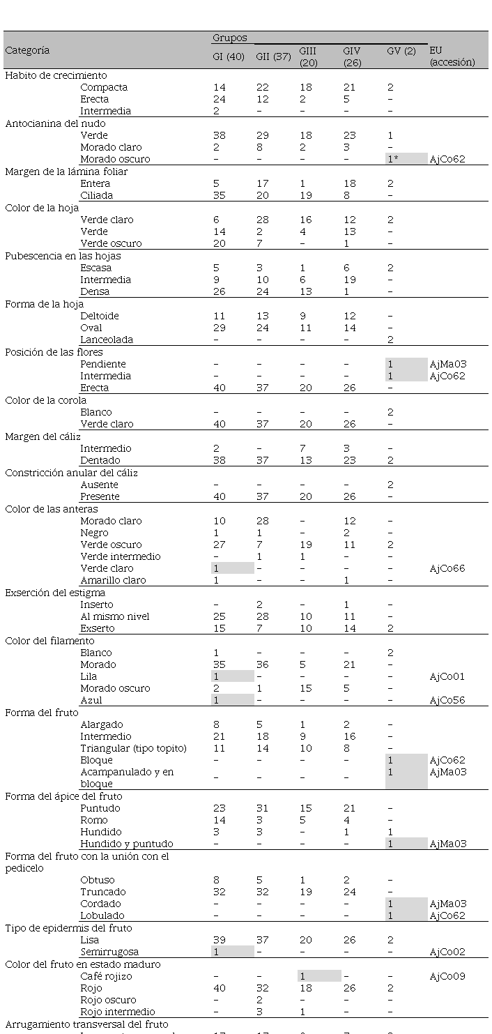 Así mismo, los atributos cualitativos por lo que se caracteriza principalmente este grupo son: habito de crecimiento (HC) erecto, antocianina del nudo (AN) verde, margen de la lámina foliar (MLF) ciliada, color de la hoja (CH) verde oscuro, pubescencia en las hojas (PH) densa, forma de la hoja (FH) oval, posición de las flores (PF) erecta, color de la corola (CC) verde claro, margen del cáliz (MC) dentado, constricción anular del cáliz (CAC) presente, color de las anteras (CA) verde oscuro, exserción del estigma (EE) al mismo nivel, color del filamento (CF) morado, forma del fruto (FF) intermedio, forma del ápice del fruto (FAF) puntudo, forma del fruto con la unión con el pedicelo (FFUP) truncado, epidermis del fruto (EF) lisa, color del fruto en estado maduro (CFM) rojo y arrugamiento transversal del fruto (ATF) intermedio. Estados únicos ó morfolalelos presentes en un único individuo de la colección de estudio, fueron encontrados en este grupo para los descriptores: CA verde claro (AjCo66), CF lila (AjCo01) y azul (AjCo56) y EF semirrugosa (AjCo02) (Tabla 4).