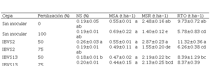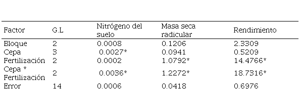 Los cuadrados medios de varianza presentaron diferencias estadísticamente significativas (α≤0.05) de los factores cepa y fertilización, así como de su interacción entre el nitrógeno del suelo, masa seca de raíces y rendimiento total (Tabla 1)