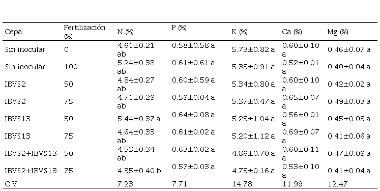 Los contenidos de nitrógeno, fósforo, potasio, calcio y magnesio el tejido foliar no presentó diferencias significativas entre los tratamientos para cada uno de los elementos minerales evaluados frente los testigos absoluto y químico. Por el contrario, en estudios realizados por Farzana y Radizah (2005), demostraron que tres aislados de rizobacterias incrementaron el crecimiento y la absorción de N, P, K, Ca y Mg en dos cultivares de batata, sin embargo, en nuestro estudio hubo un comportamiento estadístico similar entre los tratamientos y no se soporta con los resultados obtenidos por los autores.