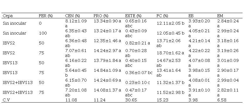 Respecto a la composición bromatológica de las raíces tuberosas (Tabla 4), se encontraron diferencias estadísticas (α≤0.05) entre el testigo absoluto frente a A. vinelandii IBVS13+75 %FN en los contenidos de cenizas, siendo superior cuando no se inoculó ni fertilizó en comparación con la cepa A. vinelandii IBVS13. Seguidamente, en el contenido de fibra cruda hubo diferencias estadísticamente significativas(α≤0.05) cuándo se inoculó P. denitrificans IBVS2+75 %FN respecto al testigo absoluto y químico. Sin embargo, para los contenidos de proteínas, extracto etéreo, energía bruta y energía metabolizable, independientemente de los tratamientos evaluados, no hubo un comportamiento diferencial estadísticamente entre ellos en función de los testigos absoluto y químico. Estos contenidos fluctúan, de acuerdo con las características genéticas del cultivar, sistema de producción seleccionado (densidad de plantas, características de los suelos, etc.) y prácticas de manejo agronómico, siendo ideal aplicar las BPA (García et al., 2016).