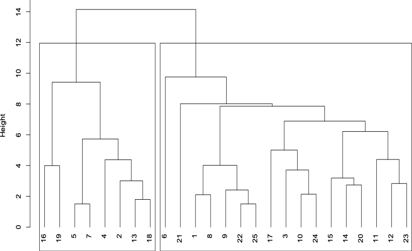 Un primer grupo, estuvo conformado por ocho clones (C16, C19, C5, C7, C4, C2, C13 y C18), destacándose los clones C4, C16, C19, C13 y C18, cuya floración fue tardía y se les realizó una sola cosecha, a diferencia del resto de genotipos a los cuales se les realizaron dos cosechas. El grupo número dos por su parte, estuvo conformado por 17 clones, que corresponden a los genotipos C6, C21, C1, C8, C9, C22, C25, C17, C3, C10, C24, C15, C14, C20, C11, C12 y C23, clúster más grande y disperso que el grupo anterior, caracterizándose por estar constituido por cinco pequeños subgrupos.