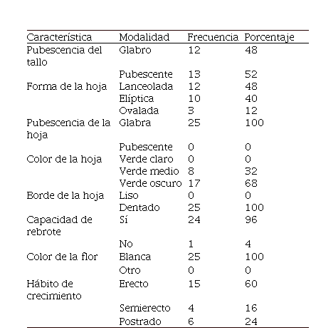 Desde el punto de vista morfológico, los clones acusaron variación en la pubescencia del tallo, forma de la hoja, color de la hoja, capacidad de rebrote y hábito de crecimiento, más no en las características asociadas con la pubescencia de la hoja, borde de la hoja y color de la flor. Las características con mayor polimorfismo corresponden a la forma de hoja, donde la modalidad lanceolada, registró un 48%, seguida de la forma elíptica con 40% y ovalada con un 12% y hábito de crecimiento, donde el 60% de los clones acusaron hábito erecto, seguido de un 24% del hábito postrado y un 16% del hábito semierecto (Tabla 1).