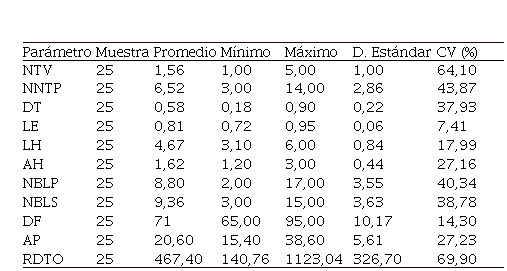 Los valores de la estadística descriptiva para cada característica están consignados en la tabla 2, donde el número de tallos verticales y rendimiento de hoja seca, presentaron los mayores coeficientes de variación, por acusar registros superiores al 60%, con valores promedios de 1,56 tallos verticales y 467 kg. ha-1; en tanto que los coeficientes de variación menor al 20%, están asociados a la longitud de los entrenudos, longitud de la hoja y días a floración, con valores promedios de 0,81 cm, 4,67 cm y 71 días a floración. Las demás características presentaron variación entre 27,16% y 43,87%.