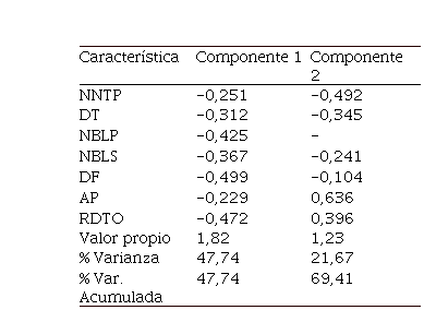 El ACP consignado en la tabla 3, registró dos componentes con valor propio superior a 1,0 resultados que concuerdan con los reportados por Adewale et al. (2010); Terzic et al. (2012); Gerrano et al. (2015), acumulando una varianza total del 69,4%.