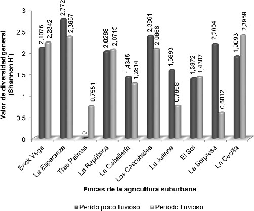 La diversidad general de un período al otro manifestó una disminución en el 50 % de las fincas estudiadas y su variabilidad estuvo entre 0 y 2,7720 (Figura 1). Los valores más bajos se presentaron en las fincas Tres Palmas para ambos períodos, así como, en el período lluvioso de La Juliana y La Sorpresa en tanto, La Esperanza, fue el sistema agrícola que mejor diversidad mostró. Corroborando los resultados obtenidos para el valor S y de DSp.