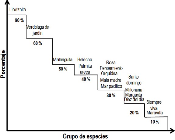 De las especies más abundantes reportadas en el período poco lluvioso, el 11,11 % son abundantes (mar pacífico (Hibiscus rosasinensis L.)), con igual porcentaje se encuentran las poco frecuentes (varita de San José) y las escasas (lloviznita y manto (Plectranthus scutellarioides (L.) R. Br.)). Las ocasionales (begonia (Begonia spp.), jardín alegre, esparrago espinoso, azucena, flor de muerto) representan el 66,67 % y son la clasificación más frecuente. En el período lluvioso disminuye el porcentaje de las especies escasas y abundantes a un 0 % mientras que el de las ocasionales (rosa, jardín alegre, alelí (Cheiranthus cheiri L.), heliconia (Heliconia caribaea Lam.)) aumentó a un 44,44 %. El de las poco frecuentes (azucena, buganvilia, rosa) y frecuentes (malanguita, flor de muerto, Itamo real (Euphorbia tithymaloides L.) también aumentó a un 33,33 % en ambos casos.
