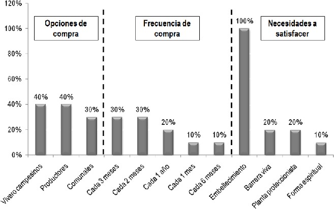 Independientemente de ello las opciones de compra (Figura 3) están vinculadas a los criterios de disponibilidad dados por el 80 % de los de los entrevistados. Resulta interesante que igual porcentaje de los informantes (40 %) refieran que los viveros campesinos y los productores influyen más en la disponibilidad de este grupo de plantas. Entonces, estas fincas pueden convertirse no solo en centros de conservación de PO sino en diseminadores de las mismas pues, utilizando métodos de propagación adecuados, se pueden apropiadamente las especies más demandadas y que por las razones expuestas no están presentes en el momento se necesitan. Lo planteado puede ser posible porque las principales compras se realizan como mínimo cada un mes (10 %) siendo las más frecuentes cada dos meses (30 %), tres meses (30 %) y un año (20 %). Ello posibilita tener márgenes de producción en este espacio de tiempo asegurando la permanencia en calidad y cantidad de las especies más demandadas. Además, las necesidades a satisfacer son a largo plazo, siendo el embellecimiento una necesidad referida por todos los informantes (100 %).