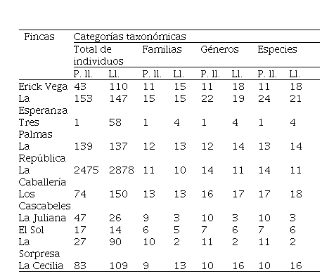 Por fincas la composición botánica (Tabla 2) también fue variable tendiendo al aumento del período poco lluvioso al lluvioso en todas las categorías taxonómicas, aunque hubo fincas donde se observó una disminución (no muy marcada) con el cambio de época. Los mayores cambios se presentaron en el total de individuos influenciado por las causas descritas al analizar la composición botánica por períodos.