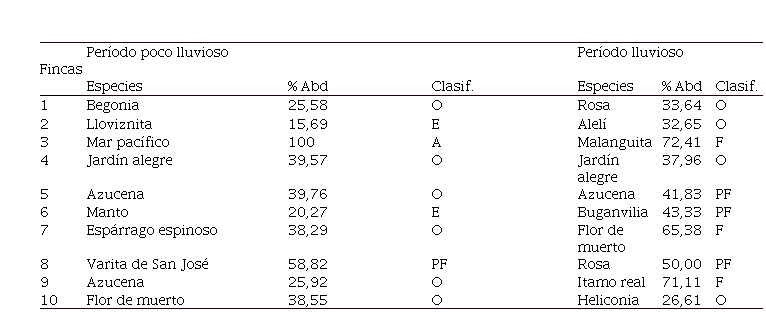 Las especies más abundantes tuvieron un comportamiento variable (Tabla 3). Muchas no solo se repiten en una misma finca de un período al otro (jardín alegre (Cuphea hyssopifolia Kunth.) y azucena (Polianthes tuberosa L.)) sino, que tienden a la repetitividad de un siste ma al otro (azucena y rosa (Rosa spp.) dentro de un mismo período. Del total de especies identificadas, 15 (26,31 %), son las más abundantes y las de mayor contribución al comportamiento de las PO dentro de cada finca.