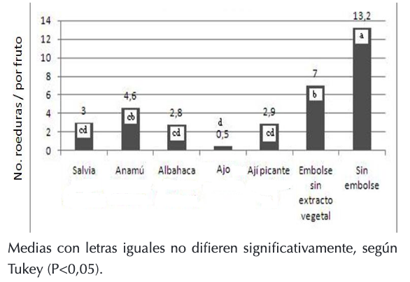 La impregnación de bolsas con extracto de albahaca, ají picante, salvia y anamú se presento una mayor severidad de roeduras/dedo de 2,8 - 2,9 - 3,0 y 4,6 respectivamente (Figura 1). Comparando estos resultados podemos decir que coinciden con reportados por Rivera et al. (2003) en cultivos de papa en Cuba, quienes manifiestan que el uso de extractos de ajo ha registrado efectos positivos en el control de artrópodos como el áfido Carolinaia cyperi en aplicaciones con una frecuencia semanal, cuyas aplicaciones contenían 43 g de ajo (dientes secos) e igual cantidad de tabaco (hojas secas) mezcladas en 3 L de agua, se pusieron en ebullición 15 min. luego se dejó reposar 17 h, se filtró por gasa y se llevó al volumen de 3 L.Por su parte Ho et al. (1996), mostro mediante investigaciones y pruebas de toxicidad encontra de los huevos, larvas y adultos de Tribolium castaneum, adultos de Sitophilus zeamais, y huevos de Z. cutaneum, donde la mortalidad de estos insectos aumentó cuando se incremento la concentración de aceite con ajo en cultivos de arroz y trigo, afirmando que la destrucción completa de los huevos se logra a 4,4 mg cm2, utilizando en el bioensayo papel filtro de impregnación.