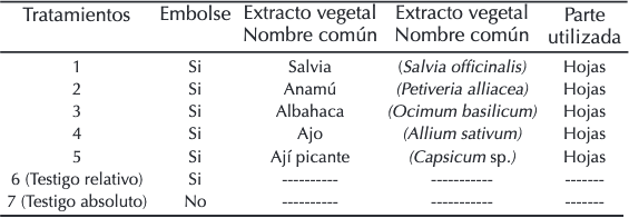Con el propósito de evaluar la eficiencia de los extractos empleados para el control de Colaspis sp. se establecieron cincos tratamientos que consistieron en extractos vegetales que se obtuvieron del jardín medicinal de la Universidad de Córdoba tales como; salvia Salvia officinalis L. (Lamiáceas); anamú Petiveria alliacea L. (Fitolacáceas); albahaca Ocimum basilicum L. (Lamiáceas); el ajo Allium sativum L. (Liliáceas) y ají picante Capsicum annuum (Solanaceae); se compró en almacenes de cadena. Los extractos se aplicaron asperjándolos con una bomba tipo jardinera de 5 litros sobre las bolsas comerciales de polietileno aplicándosele aproximadamente 50 ml de la solución acuosa (extracto + agua) (Tabla 1). Estas bolsas actuaban como protección de racimos de acuerdo a los tratamientos evaluados; y se dejaron expuestas durante una hora para su secado bajo techo, con el fin de asegurar la adherencia del producto a la bolsa de polietileno de baja densidad.