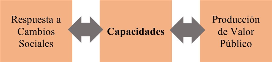 Las capacidades públicas son entendidas como el factor facilitador que permite construir valor público y alcanzar las metas de gestión en contextos de alta incertidumbre. Se basan en la capitalización y a su vez la construcción de inteligencia: organizacional, tecnológica y social, en entramados públicos a modo de ecosistemas organizacionales polifónicos. Esta noción de capacidades posee un doble sentido: por un lado, las capacidades permiten a los gobiernos adaptarse a los cambios sociales, y así dar respuesta a las necesidades, y, por otra parte, posibilitan construir direccionalidad compartida e influir en el contexto a través de la producción de valor público (Fig. 4) (Moore, 1995).