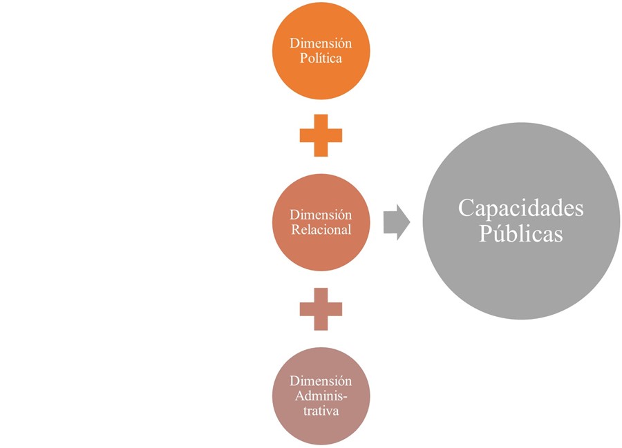 Fuente: (elaboración propia)La noción de capacidades así entendida vincula las tres dimensiones de actuación gubernamental: la política, la relacional y la administrativa (Fig. 5) (Hildebrand y Grindle, 1994; Repetto, 2004; Acuña y Chudnosky, 2017). Como se puede observar, no se trata de una mera capacidad administrativa.