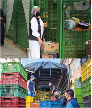 Frente a esta problemática, se pensó entonces en varias opciones: cerrar pequeños establecimientos y puestos, cerrar las grandes bodegas, esto es, implementar restricciones y protocolos por puestos, por bodegas y por zonas, a fin de regular el funcionamiento en días alternados para reducir el aforo o capacidad que se produce en condiciones normales (Legis Ámbito Jurídico, 2020). Tuvimos que garantizar los controles de acceso al lugar, según la terminación del número de cédula o documento de identidad, según los números de puestos para unificar horarios. Asimismo, controlamos el ingreso de los vehículos que transportan la mercancía al interior de la Central según el número de la placa o patente. Los controles tuvieron en cuenta que en la Central el abastecimiento está dividido en grandes productos, en pequeños productos, y esos productos, referenciados según la zona donde se entregan. Con estas medidas se garantizaron tanto los controles como buenas prácticas de manufactura y biosanitarias (Figs. 2 y 3).