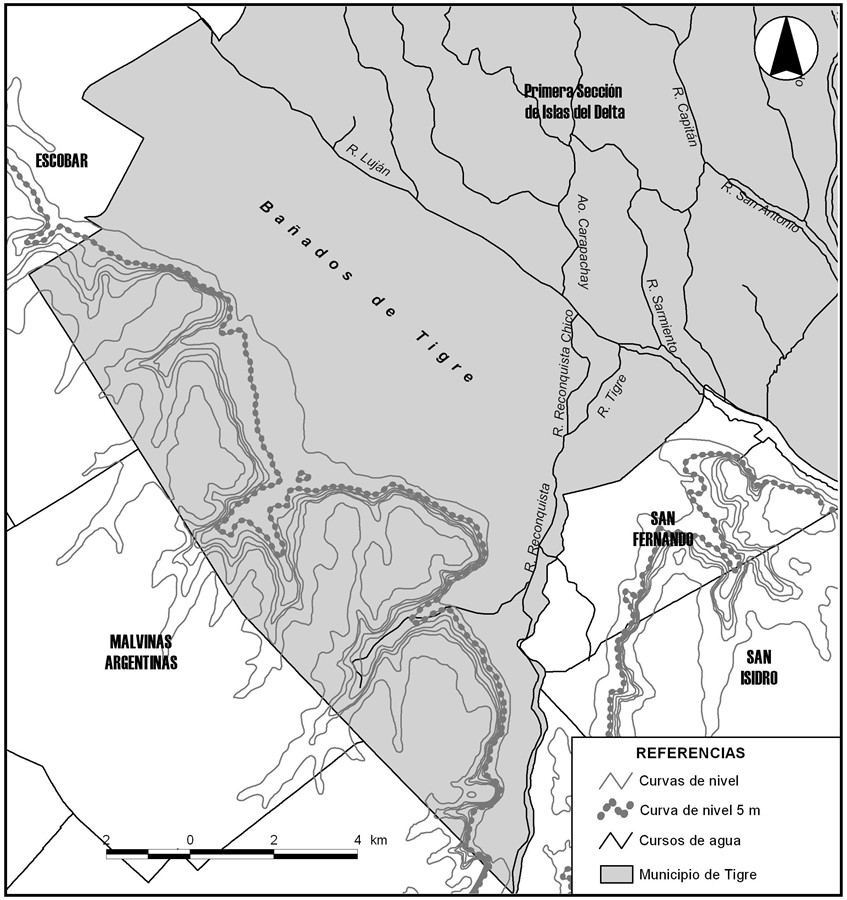 Las tierras inundables y anegables del sector continental de Tigre (Fig.1), ubicadas entre el río Luján (límite con la primera sección de islas del Delta del Paraná) y la cota de los 5 m (IGN) donde se inician las barrancas, fueron conocidas bajo distintas denominaciones: bañados (por los habitantes históricos del lugar), bajíos ribereños (como clasificación hidrogeomorfológica) o humedales continentales (según la Ecología). Esta última es la más difundida recientemente. Además de contener zonas con espejos de agua permanentes o estacionales, fauna y flora adaptadas a los pulsos de inundación y anegamiento temporales, esta franja de humedales está atravesada por el río Reconquista (el segundo más importante y contaminado de la RMBA) y una serie de arroyos que descienden de las barrancas y desembocan en el río Luján. De este modo, las crecientes de los ríos y arroyos y, en especial, por su influencia y cercanía, de las mareas meteorológicas del Río de la Plata (conocidas como sudestadas), son determinantes en la conformación de esas tierras húmedas (Ríos, 2010).