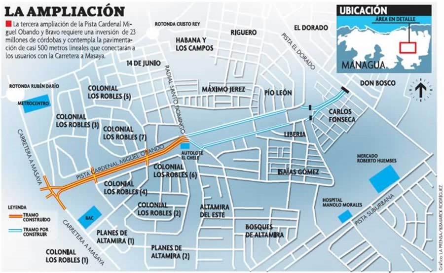 En abril de 2008, la Alcaldía de Managua inició las obras de extensión de la pista Cardenal Miguel Obando y Bravo[2] –conocida también como bulevar Miguel Obando– a través del barrio (Fig. 1). La pista es una autopista de cuatro carriles que atraviesa de este a oeste el sur-centro de Managua, y fue construida en tres etapas, con un costo total de 5.6 millones de dólares estadounidenses, lo que equivale aproximadamente al 10% del presupuesto municipal anual de Managua. Fue inaugurada oficialmente el 11 de diciembre de 2008 por el entonces alcalde de Managua, el sandinista Dionisio Marenco. Según la versión oficial, la pista debía desempeñar un papel clave en la reducción de la congestión vehicular en el distrito, a pesar de que está flanqueada por dos bulevares paralelos de orientación este-oeste que ya conectan, en líneas generales, los mismos puntos de la ciudad.