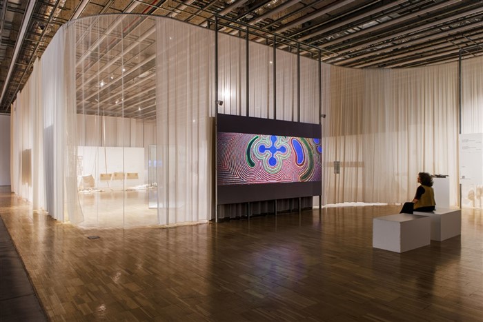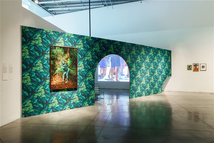 Por último, algo que es muy importante para mí, en conjunto como práctica curatorial, es resistir las simplificaciones reduccionistas y solucionistas y trabajar a través de prácticas artísticas como una manera de sostener la complejidad, de no aplacarla, de no homogeneizar, de no dar recetas. Pero también, si sostienes la complejidad al 100 x100 es un problema. Se convierte en algo indigerible, no permite intervenir tampoco. Cuando tienes la madeja de hilos, si esta está entera, no la puedes deshacer. Lo que sí puedes es ir tomando de un lado, empezar a desgranar y ver hasta dónde puedes llegar. Te atascas, tiras de otro lado y sigues tirando. Entonces, la exposición al final era eso. Cada una de las piezas era una puerta de entrada a entender la otredad desde una perspectiva concreta. En el caso del artista vietnamita-estadounidense, Tuan Andrew Nguyen, apuntando a la interconexión entre el rol del territorio, la propiedad, los mapas, el proceso colonial, la memoria, la herencia de la memoria traumática en el caso de la recuperación del territorio por parte de la comunidad aborigen en Australia. En el rol intrincado entre mapas, narrativa, legalidad y pertenencia, estaba también la pieza de la artista palestina-jordana Saba-Innab que, desde técnicas, contexto y períodos radicalmente distintos, devela procesos muy similares. Por otro lado, Joiri Minaya, artista dominicana-estadounidense, traza vínculos entre procesos históricos coloniales y sus formas contemporáneas del colonialismo, como la turistificación. Apuntando a la continuidad de estos legados coloniales, particularmente en la sexualización de los cuerpos de las mujeres negras en el Caribe. Y, por ejemplo, aun arrancando desde cuestiones historicistas como el rol de la antropología en esos procesos o desde el cuerpo, algunas de sus aproximaciones con respecto al territorio se solapan con otras obras como las de Tuan, pero aquí estás accediendo desde una lente muy distinta que tiene que ver con el género, con la racialización y con un contexto muy diferente como es el del Caribe.
