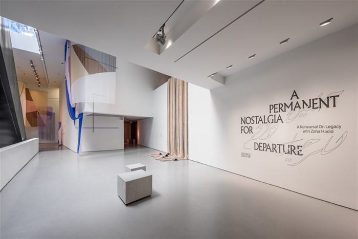 Vista de exposición, “A Permanent Nostalgia for Departure: A Rehearsal on Legacy with Zaha Hadid”. Curada por Maite Borjabad López-Pastor.