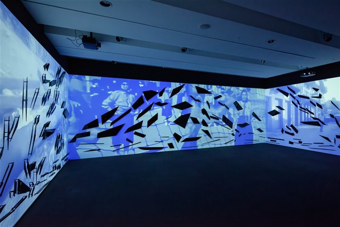La artista palestina Dima Srouji, que a partir de una motivación personal activa una de las pocas citas íntimas que conservamos de Hadid –donde menciona sus años más felices en Bagdad y Beirut–, realizó una videoinstalación autofragmentada con formas geométricas inspiradas en cinco de sus pinturas. El video, en tres canales, combina archivos de ambas ciudades en períodos de ocupación y guerra civil, pero se centra en la vida cotidiana, reivindicándolas como espacios de alegría. Desde una mirada personal y especulativa, Srouji busca comprender la experiencia de Hadid en esos años formativos.