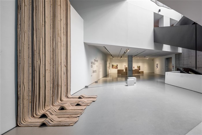 Vista de la exposición “A Permanent Nostalgia for Departure: A Rehearsal on Legacy with Zaha Hadid”. Curada por Maite Borjabad López-Pastor.