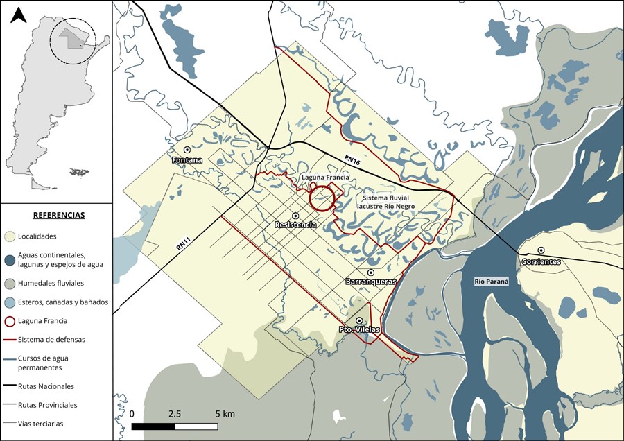 La localización de Resistencia fue decidida a fines del siglo XIX como parte de la política de colonización nacional. Sus condiciones de inundabilidad quedaron expuestas en las crecientes de 1905, 1966, 1982-83, 1992, 1998. En respuesta a la gravedad de sus consecuencias se construyeron sistemas defensivos primero del río Negro y luego del Paraná, así como obras de control para regular las dinámicas del agua en el recinto defendido y sistemas de bombeo para evacuar aguas de lluvias dada la interrupción de los drenajes naturales (Rohrmann, 2023).