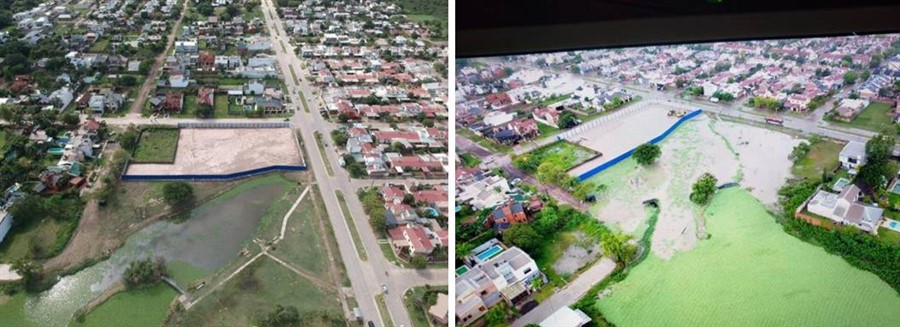 El juez decidió la acumulación de causas y convocó a una audiencia de conciliación a la que invitó como amicus curiae a la Fundación Encuentro por la Vida, Cultura y Democracia Ambiental, organización de larga trayectoria en asuntos hídricos y ambientales. Dicha audiencia no logró acercar posiciones. Tres días después, el 20/4/2019 se produjo una lluvia extraordinaria que inundó varios barrios de la ciudad y el predio. Las imágenes del predio cercado cubierto de agua, así como de bocas de registro cloacal desbordadas, se viralizaron y fueron aportadas como nuevas evidencias a la causa. (Fig. 4)