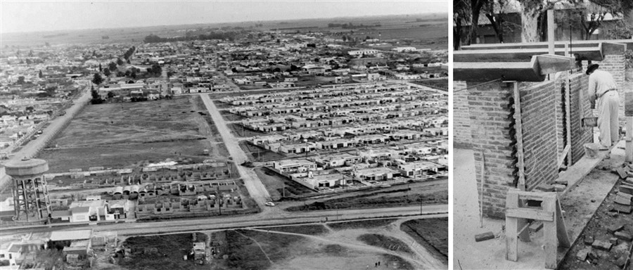 La construcción de las viviendas combinó el uso de materiales tradicionales con criterios de organización propios de la lógica industrial, priorizando la repetición de procesos constructivos con el fin de reducir costos y optimizar el uso de recursos. Por ejemplo, los pisos se realizaban a partir del vibrado de la losa de fundación, seguido de un alisado final con cinta de fieltro. Los muros se ejecutaban en dos etapas –de carga y de cierre– y contaban con una cámara de aire que elimina la necesidad de incorporar una aislación hidráulica convencional. Los cielorrasos, por su parte, se resolvían con bóvedas de ladrillo de juntas rasadas, mientras que los revestimientos en zonas húmedas se hacían con cemento alisado, lo cual reforzaba la búsqueda de soluciones económicas, durables y sencillas.