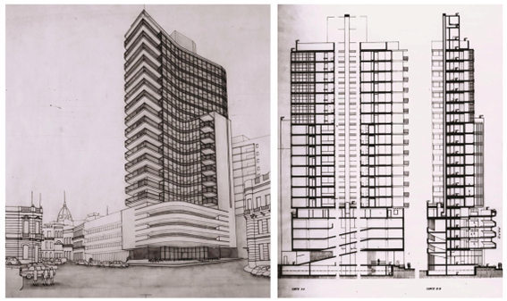 Inaugurado en 1965, el edificio Farallón se implantó estratégicamente junto a la antigua Aduana, los almacenes Pinasco y el edificio Bel Air, en un entorno cargado de referencias históricas. Con sus 70 metros de altura, no solo superó la cota máxima permitida en ese momento en la ciudad, sino que también incorporó elementos significativos del paisaje urbano circundante, interpretándolos desde una perspectiva contemporánea.