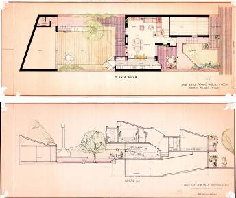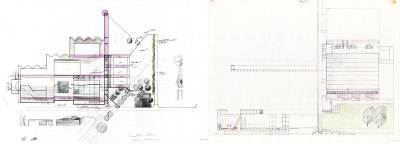Izquierda: Planta. Aerógrafo sobre hoja blanca. Derecha: Vista y Corte. Lápices y estampas sobre hoja de calcar.