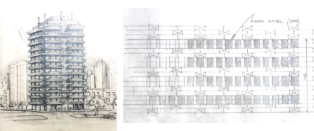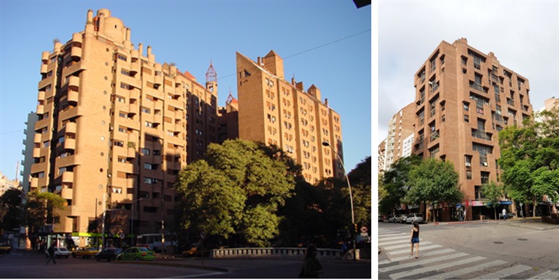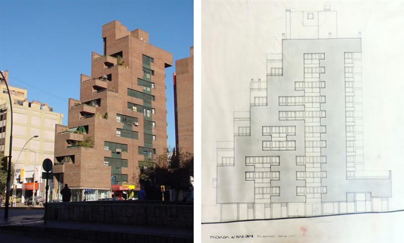 A partir de entonces, una serie de edificios fueron diseñados y construidos, en su mayoría para clientes privados; sin embargo, al crecer empezó a financiar y construir con fondos propios. La Cañada se convirtió en el principal foco de localización de sus edificios en altura y en el recientemente ampliado bulevar San Juan. En este encuentro de esquinas, el edificio Florida II (1971) proyectado con terrazas abiertas hacia el arroyo y juegos volumétricos de ladrillo visto (Fig. 4). Fue apodado “el escalonado” y continúa siendo un desafío para los primeros croquis de estudiantes de Arquitectura.