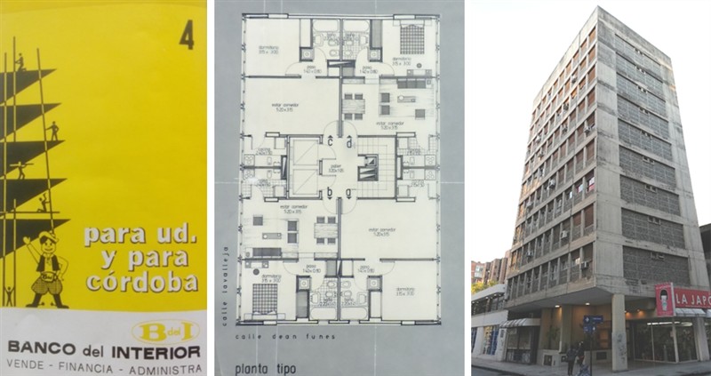 La etapa empresarial comenzó a ganar complejidad para 1967, cuando proyectaron, con apoyo de una inmobiliaria local, el edificio residencial Plaza Malanca, ubicado en La Cañada, un arroyo sistematizado acompañado de vegetación de tipas que constituye un ícono en el paisaje urbano del centro de la ciudad de Córdoba. En el archivo se conserva, una folletería en formato de tríptico, elaborada en el estudio para difundir la propuesta de venta, donde presenta una planta equipada (Fig. 3). Algunos de los rasgos que luego serían parte del carácter de Togo Díaz, el juego volumétrico, la concepción de un objeto integral con cinco fachadas, el cuidado por el detalle. La envolvente de las 4 fachadas fue resuelta con estructura independiente de hormigón armado a la vista y placas premoldeadas con canto rodado a la vista que eran elaboradas in situ.