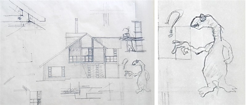 La producción de viviendas individuales seguía otra lógica, más vinculada al ejercicio liberal de la profesión. Proyectaba en la oficina, pero también “llevaba trabajo a casa” donde colaboraba su esposa, Sara Betty Yadarola (Ojeda, 2019). En los registros documentales se observa la interacción del trabajo con la vida familiar, con los niños de la casa, donde por ejemplo, en una esquina de un plano de una vivienda aparece la figura de ET, el extraterrestre de la película de Steven Spielberg de los años 80, dibujada por el arquitecto para alguno de sus hijos (Fig. 5).