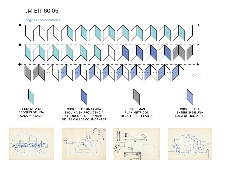 En el AHJVA, la lectura del contenido de los Cuadernos Fundadores ha ido de la mano con proyectos de investigación que buscan ejes temáticos o conceptuales para orientarse en el material. Por ejemplo, Duimovic –investigadora adscrita al proyecto Entre Páginas y Dibujos– centró su análisis en los procesos del pensamiento creativo documentados en los cuadernos, leyendo transversalmente cómo se desarrollan ideas a través de iteraciones y reiteraciones de dibujo y escritura (Duimovic, 2025). Esta lectura transversal implicó identificar patrones y tipologías comunes en distintos cuadernos y autores, tales como la interacción mano-ojo-mente en el acto de diseñar, o la secuencia de representación gráfica que va desde la manifestación de la idea inicial hasta la concreción de una idea. Otro enfoque de lectura ha sido el de Oñate (2025), quien comparó cuadernos-bitácora de tres maestros (Márquez, Cruz, Casanueva) para desentrañar aspectos de la práctica relacionados a su capacidad latente de dar cabida y asistir procesos de conocer y hacer sentido (Oñate, 2025). En su lectura, puso atención a elementos como las relaciones gráficas y textuales que los autores establecen como se ve en la figura 4, la estructura de la página (disposición y concatenaciones de dibujo y texto) como se ve en la figura 5 y las interlocuciones implícitas (auto-preguntas, notas dirigidas, citas) como se ve en la figura 6.