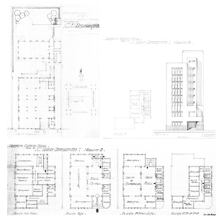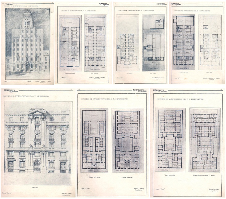 Imágenes de los anteproyectos ganadores del 2do y 3er premio del concurso para el Centro de Unión Dependientes, realizado en 1929 (el 1er premio fue declarado desierto). Arriba: 2do premio; anteproyecto de los arquitectos Durand, Pibernat y Loizaga. Abajo: 3er premio; anteproyecto de los arquitectos Hortal y Godoy. Fuente: (1929). Concurso de anteproyectos del Centro Unión Dependientes. El Constructor Rosarino, (69), 25-31.