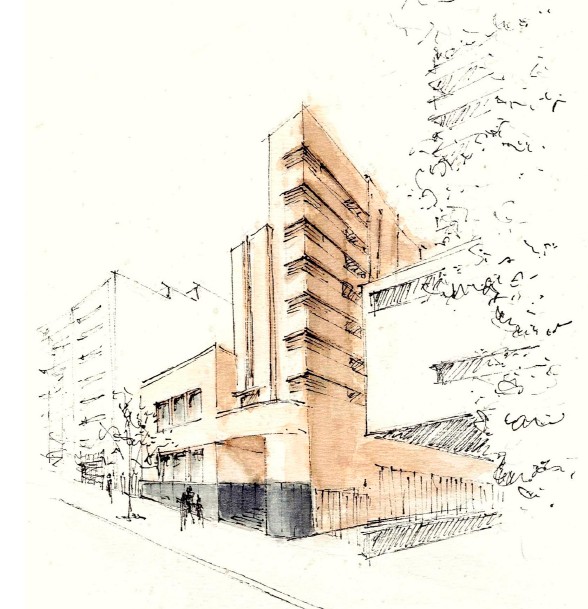 Perspectiva con acuarela del edificio en su estado actual. Autora: Arq. Florencia Ciceri.