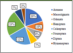 La colecta de especímenes fue de 16 en aguacate, 25 en mandarina y 21 en los casos que se contó con ambos cultivos en la finca (Figura 3). Respecto a los órdenes encontrados (Figura 4), el 23% de los especímenes correspondió a Neuroptera, 22% a Coleoptera y 20% a Araneae; que representan el 65% de la biodiversidad observada. Estudios desarrollados por Collantes y Rodríguez (2015), sobre parasitoides asociados a aguacate y mandarina, reflejaron que, el 41.3% pertenecieron al Orden Hymenoptera, Familia Ichneumonidae, de la cual la especie Diplazon laetatorius (Fabricius, 1781), representó 2.17% de lo colectado y es parasitoide de larvas de Syrphidae, de acuerdo con Korytkowski (1967). Esto explicaría parcialmente el no haber encontrado mayor representatividad de la familia Syrphidae, durante el presente estudio.