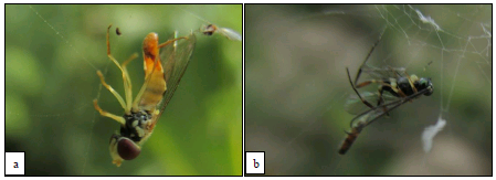 Lo observado en campo, respecto al rol desempeñado por las arañas como agentes de control biológico, coincide con lo expuesto por Aguilar (1988),Jocqué y Dippenaar-Shoeman (2006). Por ello, se requiere conocer más sobre su taxonomía, ecología y comportamiento, a fin de que las labores culturales a desarrollar sean compatibles y favorezcan el establecimiento de artrópodos benéficos. Sin embargo, considerando lo afirmado por Benamú (1999) y Schowalter (2011), las arañas son depredadores generalistas-oportunistas, pudiendo cazar también a organismos benéficos, como se observa en la figura 5