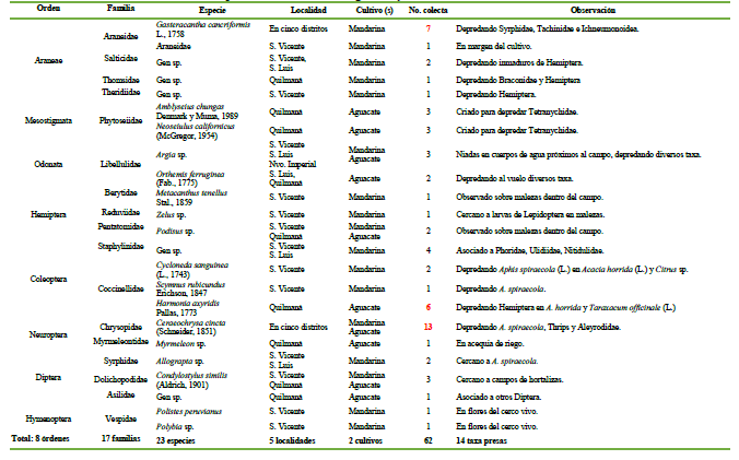 De acuerdo con los resultados, se encontró ocho órdenes, representados por 17 familias, 23 especies, con un total de 62 especímenes colectados. Las especies más abundantes fueron, de insectos, Ceraeochrysa cincta (Schneider, 1851) (Neuroptera: Chrysopidae), con 13 especímenes colectados en aguacate y mandarina, seguida por Harmonia axyridis Pallas, 1773 (Coleoptera: