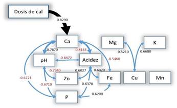 Es interesante destacar que la dosis de cal influyó positivamente sobre el pH (rs=0,7965, α=0,0029) con efectos negativos, como era de esperar sobre el Zn (rs=-0,7576, α=0,0046) y el Fe (rs=-0,6765, α=0,0114), pero este efecto negativo se manifestó también sobre el fosforo asimilable (resq=- 0,8667, α=0,0080), que se puede observar en la Figura 8.