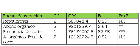El análisis de varianza para la variable rendimiento de materia seca indica que se encontró diferencia significativa en los niveles de abono orgánico, más no así en la interacción abono orgánico por frecuencia de corte. Sin embargo, para la frecuencia de corte hubo diferencias altamente significativas (P<0.01) en la variable rendimiento de materia seca (Cuadro 2).