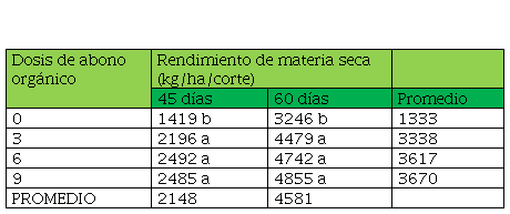 Cabe señalar que los rendimientos de materia seca realizando cortes a los 45 días y aplicando 6 y 9 toneladas de abono orgánico/ha (2492 y 2485) en este trabajo fueron superiores a los reportados por Pinzón y Montenegro (1978), con Panicum maximum y fertilización a base de 225 y 80 kg/ha de Nitrógeno (N) y Fósforo (P205) respectivamente y rendimiento de 2378 Kg/ha de materia seca.