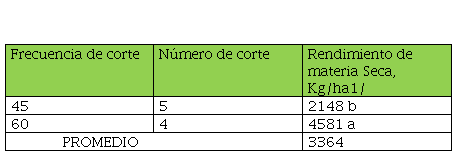 La frecuencia de corte tuvo un efecto altamente significativo (P<0.05) sobre la producción de materia seca.