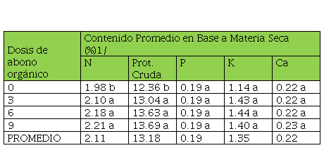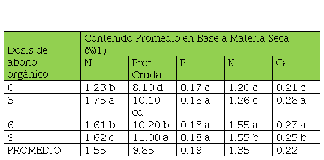 Con la aplicación de 3 ton/ha de abono orgánico se obtuvieron los mayores porcentajes de nitrógeno, potasio y calcio (1.75, 1.55 y 0.28%, respectivamente) en la materia seca, mientras que los mayores porcentajes de proteína cruda y fósforo en la materia seca se obtuvieron con la aplicación de 6 y 9 ton/ha de abono orgánico.