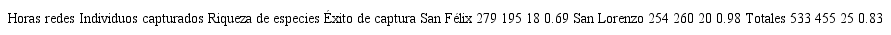 El esfuerzo de captura total abarcó 533 horas redes, con lo cual se atraparon455murciélagos, 195 en San Félix y 260 en San Lorenzo. En el éxito de captura promedio para las dos zonas de manglar fue 0.83, lo que corresponde aproximadamente a un murciélago capturado por cada hora red. Por localidad, este valor en San Félix fue de 0.69, mientras que en San Lorenzo fue de 0.98 (Cuadro 1). Las curvas acumulativas de especies según tres estimadores no paramétricos muestran que con el esfuerzo aplicado se obtuvo una estimación de la riqueza de especies similar a las 27 especies esperadas, obteniéndose en la práctica 25 de ellas (Figura 1).