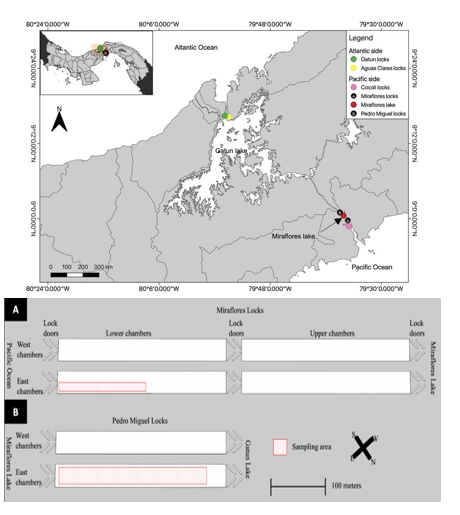 Since its opening in 1914, the Panama Canal has served as a freshwater transoceanic passageway connecting the Atlantic and the Pacific Oceans (Bennett & Hammond, 1915). The Panama Water Lock System helps the vessels entering to the canal are lifted to the higher level and later dropped down to the sea level at the other end of the canal- Today, the Canal has 5 sets of locks, two of which were recently inaugurated in 2016. On the Pacific side there are three locks. The original Miraflores and Pedro Miguel locks occurred in sequence while the new Cocoli Lock is in parallel with them (Fig. 1). Miraflores locks has 2 sequential chambers, and Pedro Miguel has one in each direction. On the Atlantic side the Gatun locks has 3 chambers in sequence. Each one of the old chambers is a box made of reinforced concrete measuring 304.8 m (1000 ft) long by 33.5 w (110 ft) with an average depth of 26 meters (40 ft) (ACP, 2020). This mechanism has operated for 100 years without appreciable increases in the salinity of Gatun Lake, and has largely prevented the migration of marine species from one ocean to the other. We focused on the diversity reported in the original locks since the new locks haven´t yet been surveyed.