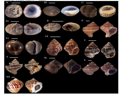 Fig. 2 Gastropod species from the Miraflores and Pedro Miguel locks in the Panama Canal. A) Diodora saturnalis (Carpenter, 1864), B) Clypeolum latissimum (Broderip, 1833), C) Nerita scabricosta Lamarck, 1822, D) Bostrycapulus calyptraeiformis (Deshayes, 1830), E) unidentified sample, F) Monoplex wiegmanni (Anton, 1838), G) Pseudozonaria arabicula (Lamarck, 1810), H) Anachis lyrata (G. B. Sowerby I, 1832), I) Anachis varia (G. B. Sowerby I, 1832), J) Eupleura nitida (Broderip, 1833), K) Stramonita biserialis (Blainville, 1832), L) Thaisella kiosquiformis (Duclos, 1832), M) Triumphis distorta (Wood, 1828). Scale bars 5 = mm.