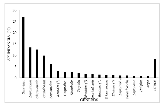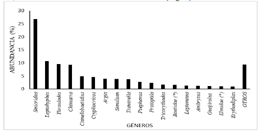 Mientras que, los géneros menos abundantes fueron: Leptohyphidae (género sin determinar), Anacroneuria, Hetaerina, Prebaetodes, Baetis, Americabaetis, Corydalus, Heterelmis, Macrelmis, Perithemis, Limnocoris, Baetodes, Calosopsyche, Erpetogomphus, Desmogomphus, Macrothemis, Chironomidae (género sin determinar), Empididae (género sin determinar), Terpides, Belostoma, Naucoris, Cloeodes, Lethocerus, Hexatoma, Paracloeodes, Farrodes, Petrophila, Crambidae (género sin determinar), Agriogomphus, Palaemnema, Hydropsychidae (género sin determinar), Leucotrichia, Phanocerus, Xenelmis, Huleechius, Haliplus, Lampyridae (género sin determinar), Hemerodromia, Tabanidae (género sin determinar), Caenis, Ulmeritoides, Ephemeroptera (género sin determinar), Telebasis, Progomphus, Brachymesia, Libellulidae (género sin determinar), Elasmothemis, Elga, Odonata (género sin determinar) y Marilia quienes representaron el 9,36 % de los individuos (Fig. 4, como otros).